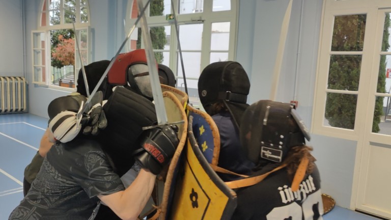 Nous pratiquons le combat militaire. A ce titre nous y incluons l’escrime à l’épée une main et grand bouclier, la dague, la lutte, le combat de groupe.