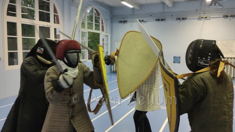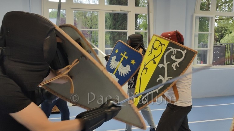 La pratique martiale au XIIIème siècle fait appel à des compétences et armes variées. Epée et grand bouclier, dague, lutte, bocle. Ces techniques convergent vers un seul but : Une efficacité martiale complète.